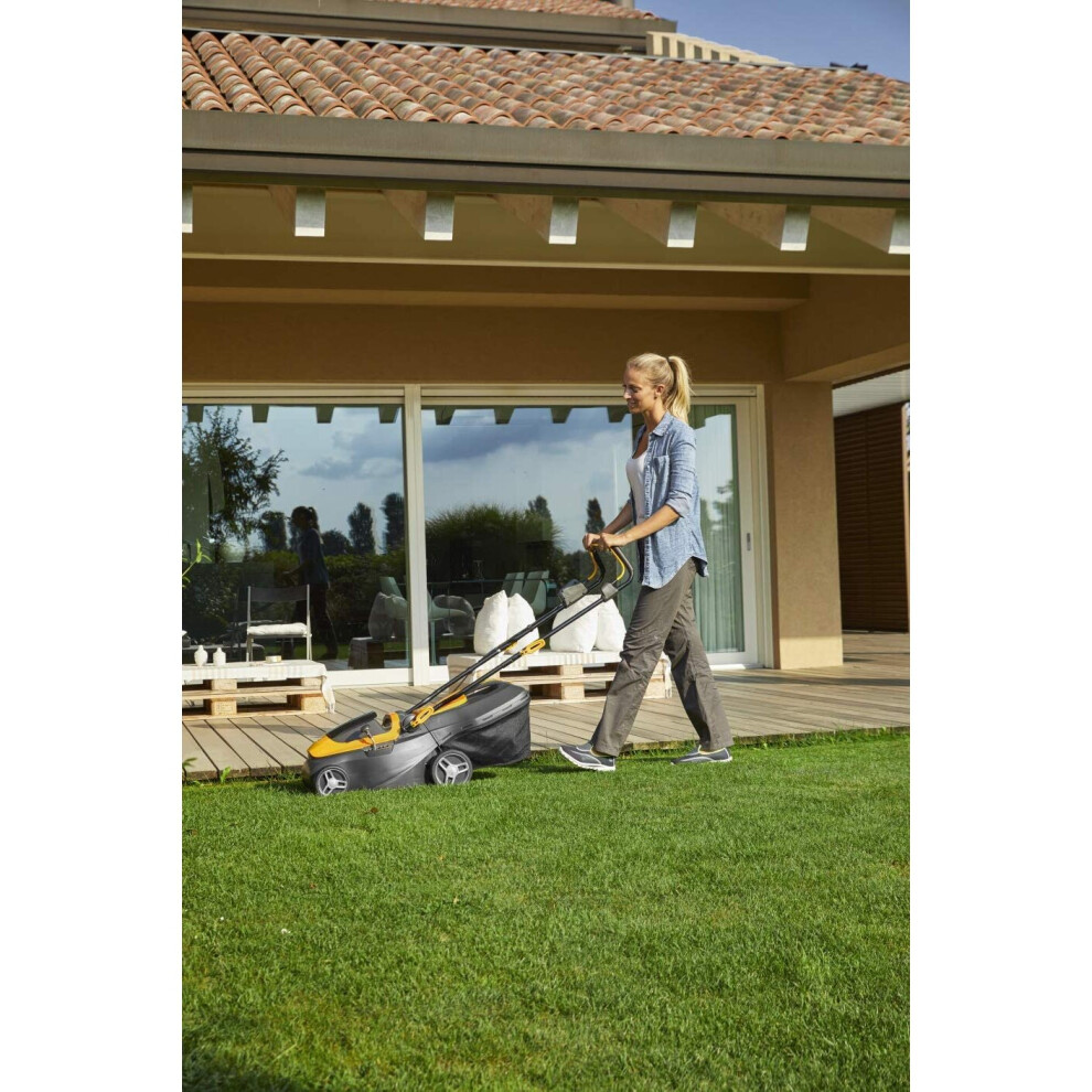 The Collector 136e Kit is a compact, battery-powered lawn mower that's as good for the garden as it is for the planet. Simply insert the safety key, press start and you're ready to mow. You'll be able to cover 250sqm in one charge – that's bigger than a tennis court. With no cables, it's simple to manoeuvre for swift, stress-free cutting. And because it's battery powered, it's far quieter than most standard lawn mowers. For added comfort, the Collector 136e Kit features a soft-grip handlebar, adjustable to two positions, as well as a comfortable carry handle for easy lifting. When it comes to cutting, the 34cm deck can be adjusted to six different heights to suit the season or conditions. Grass is captured in the 35l hybrid grass bag with a sturdy plastic top and textile lower section for high capacity and easy storage. Zip around beds, borders, ponds and pathways. Then, when you're done, the Collector 136e Kit just folds away.